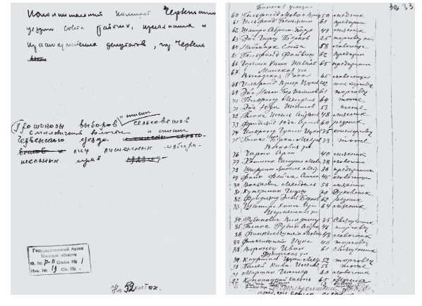 Список лиц, лишенных избирательных прав на выборах в сельсоветы Смиловичской волости. Титульный лист (слева) и лист 3. 1929