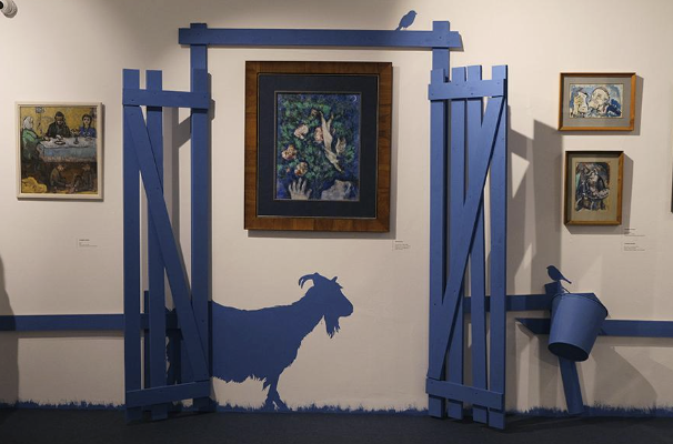 В начале экспозиции зритель оказывается в белой комнате с голубыми воробьями, курами и козами, у покосившегося голубого плетня. Это земной мир местечка, описанного Шолом-Алейхемом, или бедняцкого предместья губернских городов — Витебска, Минска, Винницы, где прошло детство Марка Шагала, Натана Альтмана, Соломона Юдовина, Танхума (Анатолия) Каплана, Соломона Гершова, Давида Гобермана.