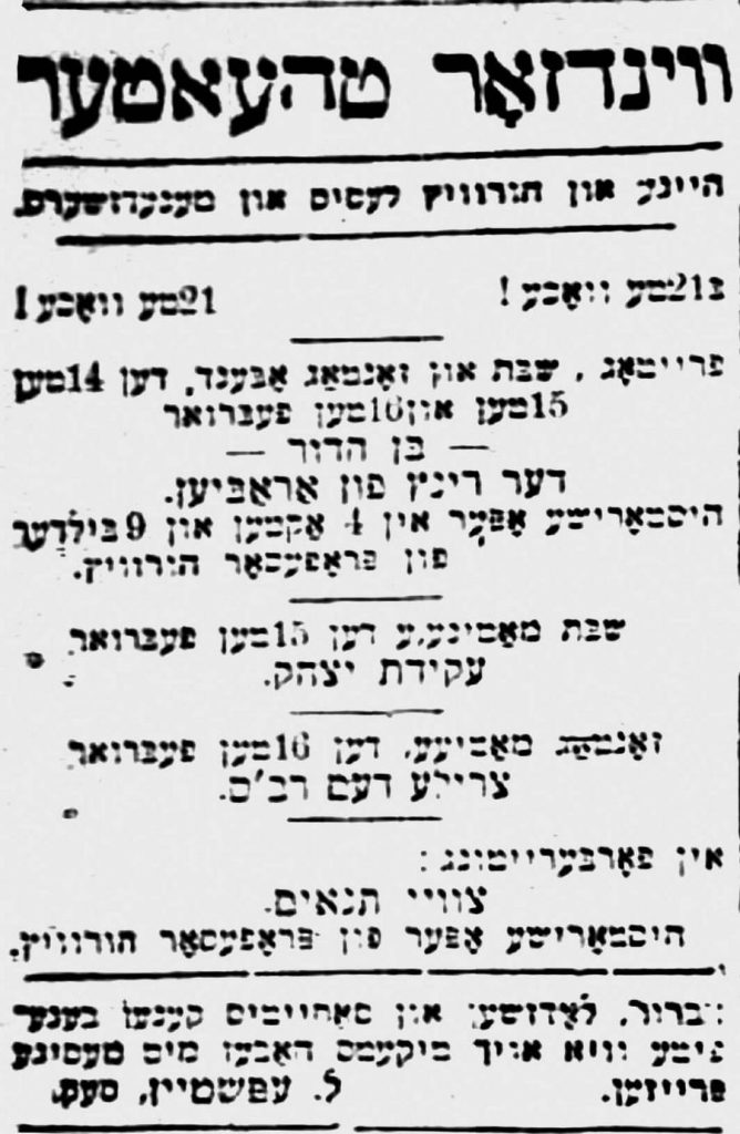 Объявление о постановке оперетты «Цвей тноим» в Виндзорском театре в «Форвертс». Нью‑Йорк. 1902