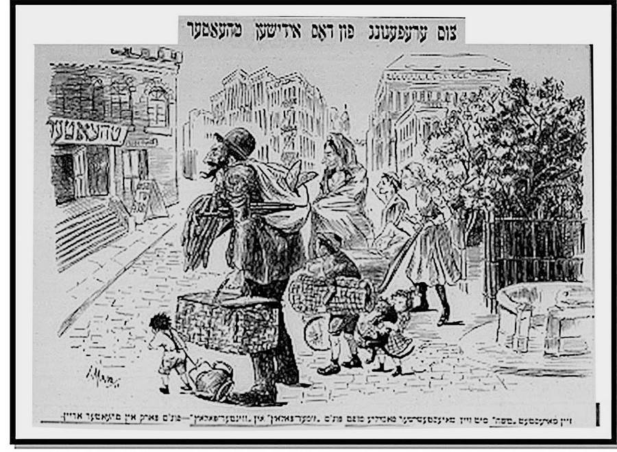 В 1910 году сатирический журнал Der Kibitzer опубликовал карикатуру: потрепанная еврейская семья со всем скарбом стоит у театра, сияя от радости. Подпись гласит: «Его величество Мойше с величественным семейством перебрался из летней резиденции в зимнюю — из парка в театр». Мойшами насмешливо называли недавних еврейских эмигрантов. Аналогия с «резиденцией» — чуть издевательская, но точная. Объясним, почему.