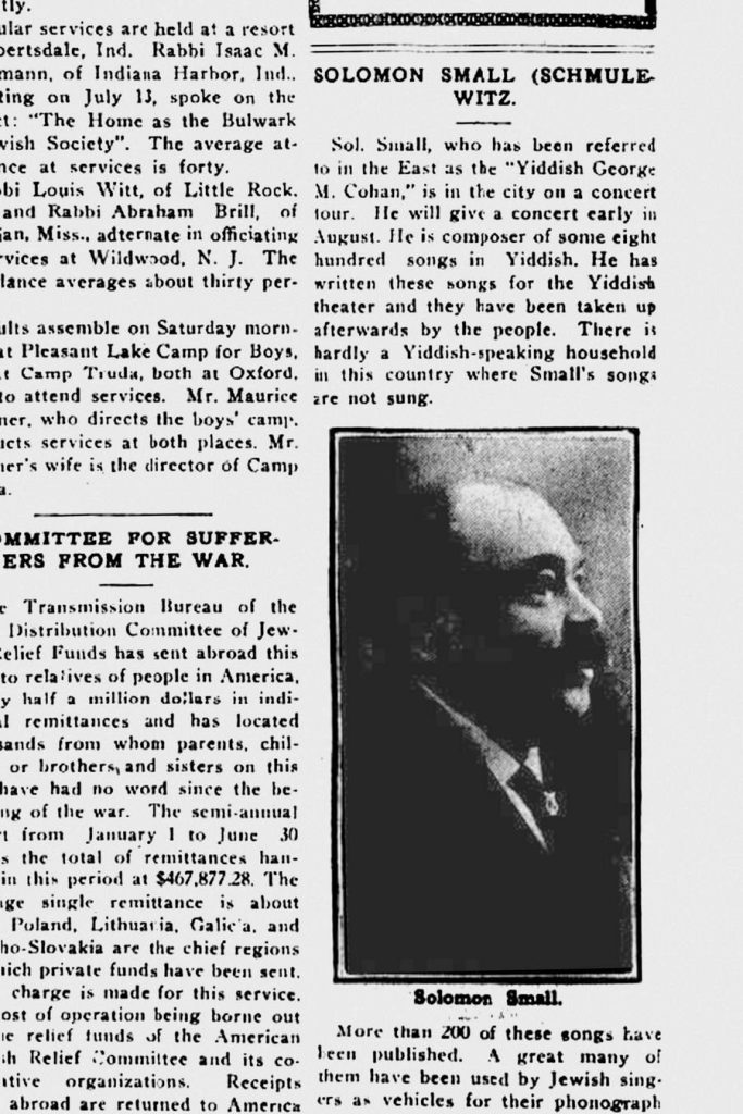 В газете The Jewish Voice за 1919 год мы видим объявление о его выступлении в Нью‑Йорке: «Вряд ли найдется семья, где говорят на идише и не поют песни Соломона Смолла».